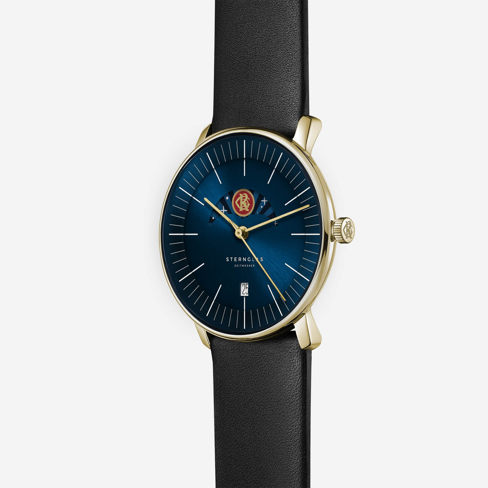 Mit der Edition Roncalli präsentiert STERNGLAS eine Uhr, die eine Hommage an all die feinen und spektakulären Momente darstellen soll, die das Circus Theater Roncalli ausmachen. Die Uhr besticht durch das sonnengeschliffene Zifferblatt in Roncalli-blau und ihr champagner-goldenes Gehäuse. Als Mondphase dargestellt, wandert das Roncalli-Logo je nach Mondstand über das Zifferblatt. Bei 6 Uhr befindet sich eine Datumsanzeige, darüber das STERNGLAS-Logo. Der äußere zarte Höhenring (Rehaut) ähnelt den Rängen einer Zirkustribüne. Angetrieben wird das 38 mm große Modell vom analogen Quarzuhrwerk Ronda 708. Die Rückseite und die Krone zieren eine Roncalli-Editionsgravur. Das klassische schwarze Kalbslederband, die dünnen Nadelzeiger und die feingliedrige Minuterie verleihen der Uhr die nötige minimalistische STERNGLAS-Optik.