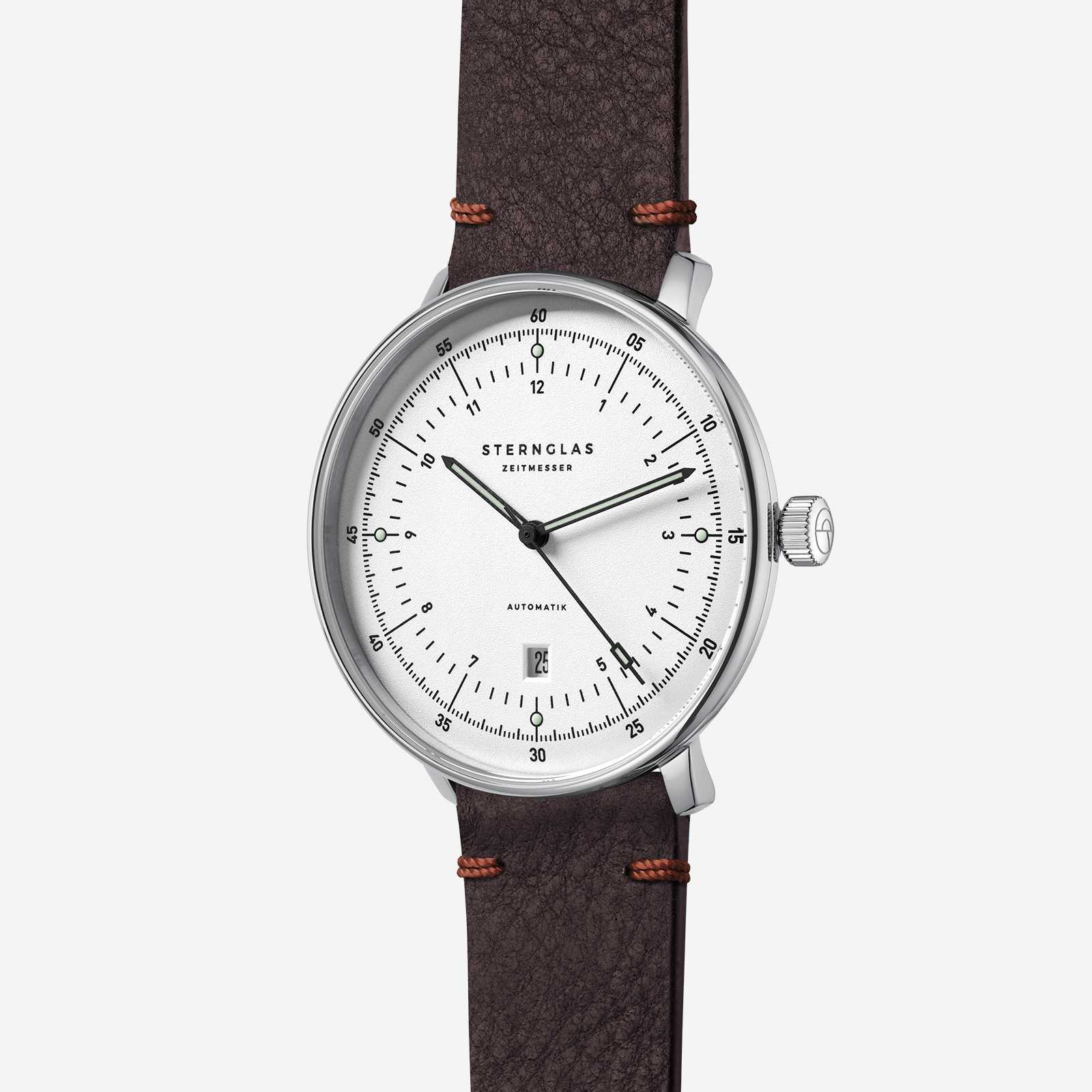 Inspiriert von Messinstrumenten aus der Seefahrt liegt der Fokus bei der Hamburg Automatik klar auf der Funktion. Die norddeutsche Hafenstadt verbindet viel mit der Schifffahrt und das spiegelt sich auch in der Gestaltung wider. Die Größe von 42 mm macht sie zur idealen Alltagsuhr für den Mann, der Wert auf Stil, Praktikabilität und Präzision legt. Die detaillierte Zifferblattgestaltung und das präzise 3-Zeiger Automatikwerk mit Datumsfunktion unterstreichen den technischen Charakter. Das silbrig- oder graphit-satinierte Zifferblatt mit feiner Wölbung wirkt anspruchsvoll, wertig, aber nicht auftragend. Die Hamburg Automatik verkörpert wie kein anderes Modell den hanseatischen Charme, Ehrlichkeit und ein Auge fürs Detail.