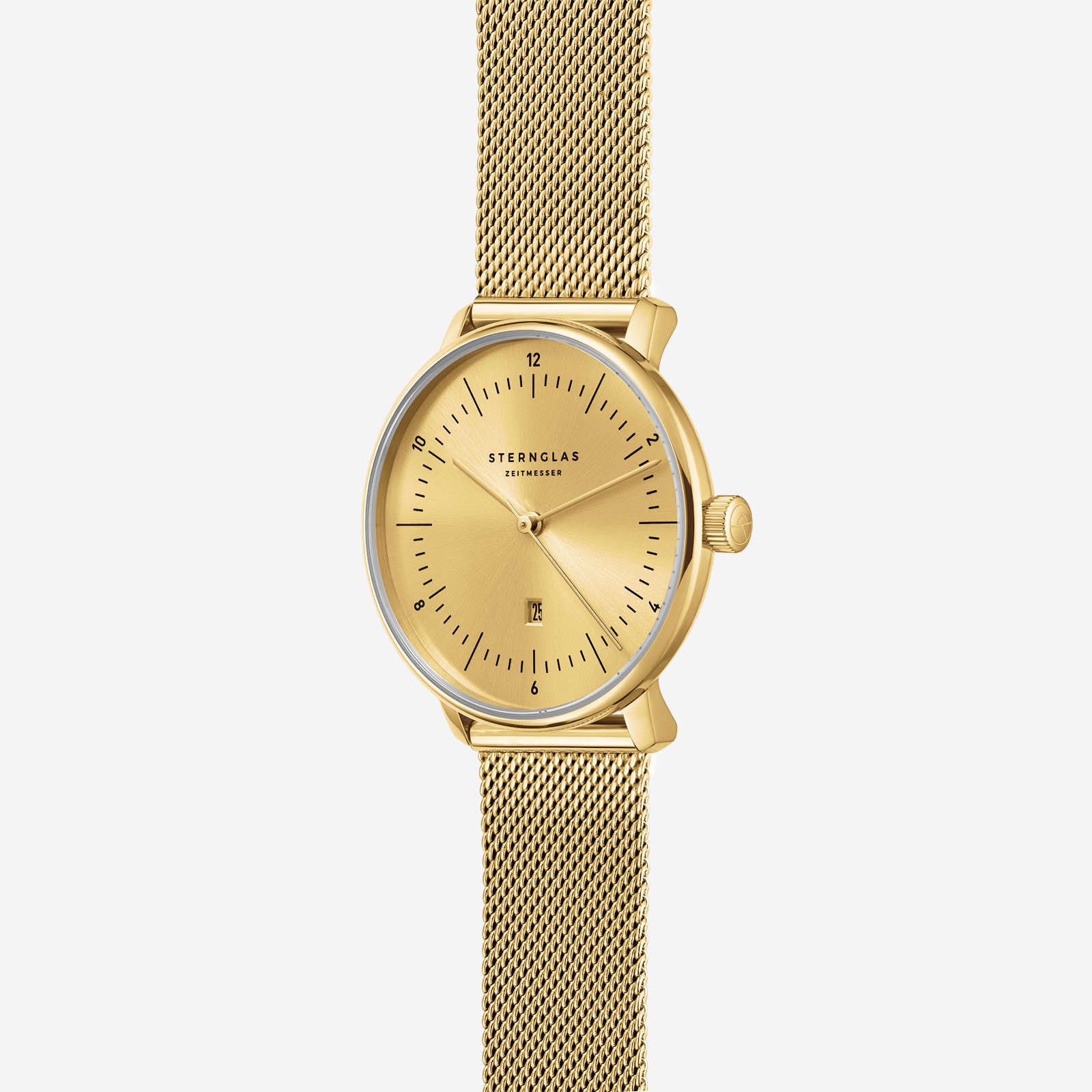 Geschützt wird das Zifferblatt von einem doppelt gewölbten und beidseitig entspiegelten Saphirglas, das als besonders kratzfest gilt und für dauerhafte Klarheit sorgt. Das 33 Millimeter große Gehäuse ist bis fünf Bar wasserdicht und trägt sich mit nur 36 Gramm angenehm leicht.
