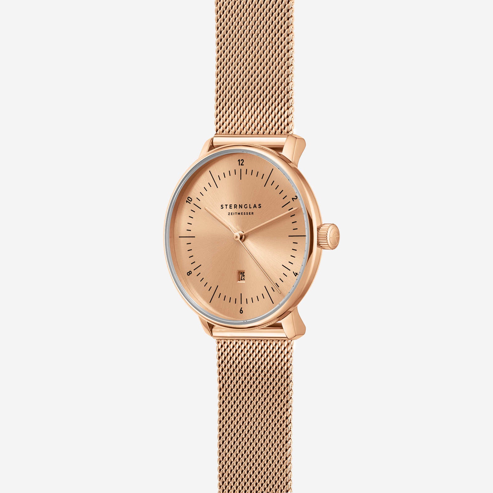Geschützt wird das Zifferblatt von einem doppelt gewölbten und beidseitig entspiegelten Saphirglas, das als besonders kratzfest gilt und für dauerhafte Klarheit sorgt. Das 33 Millimeter große Gehäuse ist bis fünf Bar wasserdicht und trägt sich mit nur 36 Gramm angenehm leicht.