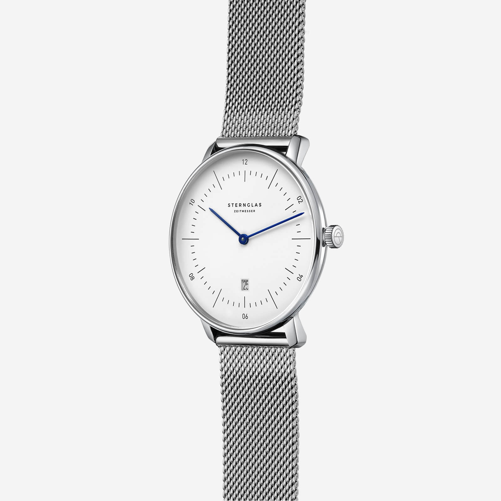 Die Naos XS besticht wie ihr großer Bruder, die Naos in 38 mm, durch ein flaches Gehäuse aus poliertem 316L Edelstahl mit gerade einmal 6 mm Höhe. Damit gleitet sie geschmeidig unter jeden Hemd- oder Blusenärmel. Neben der klassischen silberfarbenen Variante ist sie in einem edlen Champagner-Goldton erhältlich.