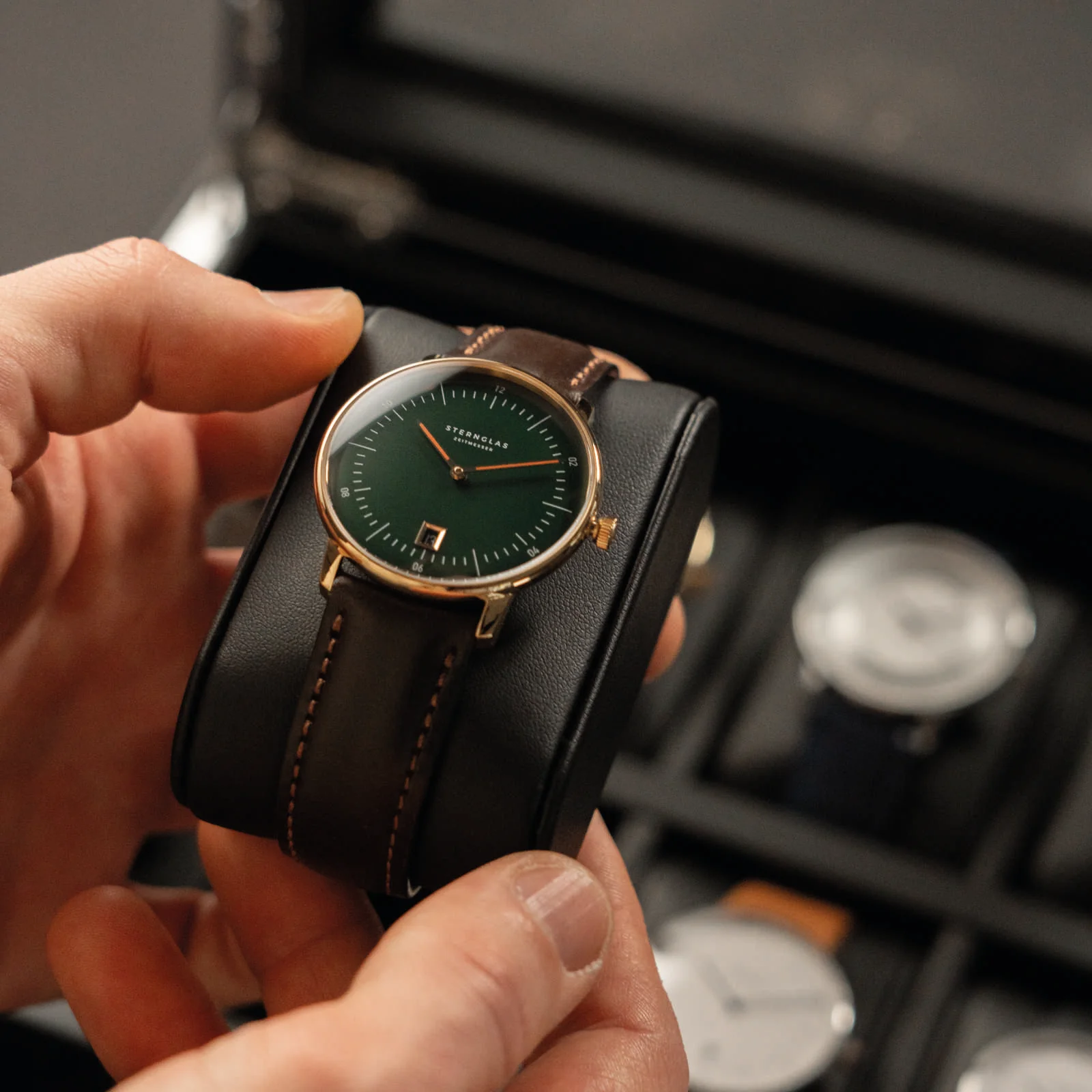 Unsere hochwertige Sammlerbox aus schwarzem Eichenfurnierholz eignet sich perfekt, um Deine Sternglas-Sammlung in Szene zu setzen. Passend für 8 Uhren.
