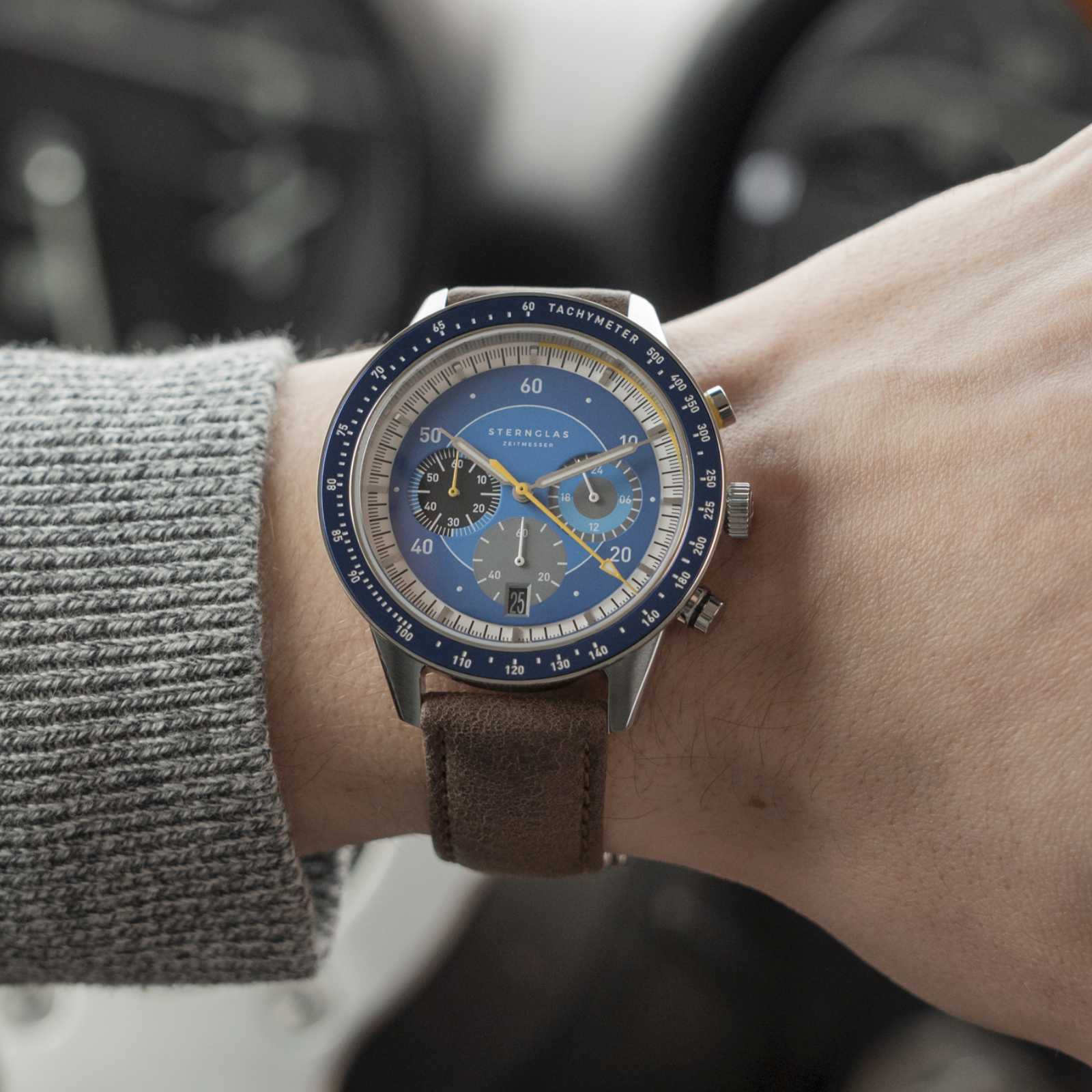 Der sportliche Tachymeter 2.0 erscheint wahlweise in zeitlosem schwarz silber mit feurigroten Akzenten oder in einem maritimen dunkelblau silber mit signalgelben Akzenten. Mit seinem eindrucksvollen 44 mm Gehäuse aus poliertem und gebürstetem 316L Edelstahl ist er der aktuell größte Zeitmesser im STERNGLAS-Sortiment. Das ermöglicht eine hervorragende Übersicht und Ablesbarkeit: sei es bei der Uhrzeit oder der Tachymeterskala.