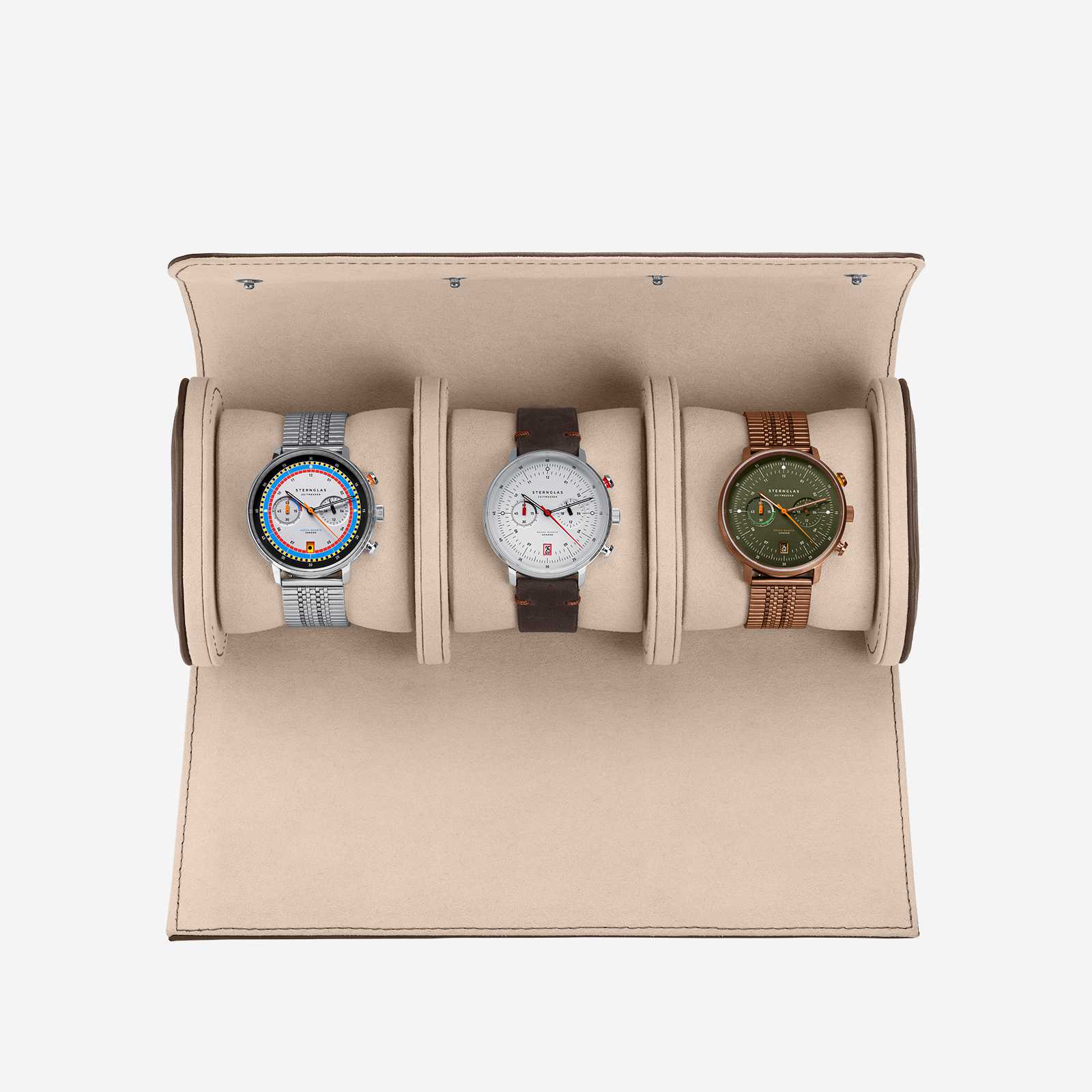 Mit der neuen STERNGLAS Uhrenrolle bringst Du Deine Zeitmesser stilvoll und sicher ans Ziel. Diese hochwertige Uhrenrolle bietet Platz für bis zu drei Deiner liebsten STERNGLAS Modelle und ist der ideale Begleiter auf Reisen oder zur stilvollen Aufbewahrung zu Hause. Die abnehmbaren Kissen mit praktischen Druckknöpfen ermöglichen ein müheloses Einsetzen und Entnehmen Deiner Uhren, während das weiche Innenfutter für optimalen Schutz sorgt. Erhältlich in elegantem Schwarz oder edlem Dunkelbraun, veredelt durch das geprägte STERNGLAS Logo. Übrigens kommt die Uhrenrolle in einer hochwertigen Geschenkbox – einfach Geschenkpapier drum, und schon hast Du das perfekte Präsent für Uhrenenthusiasten.
