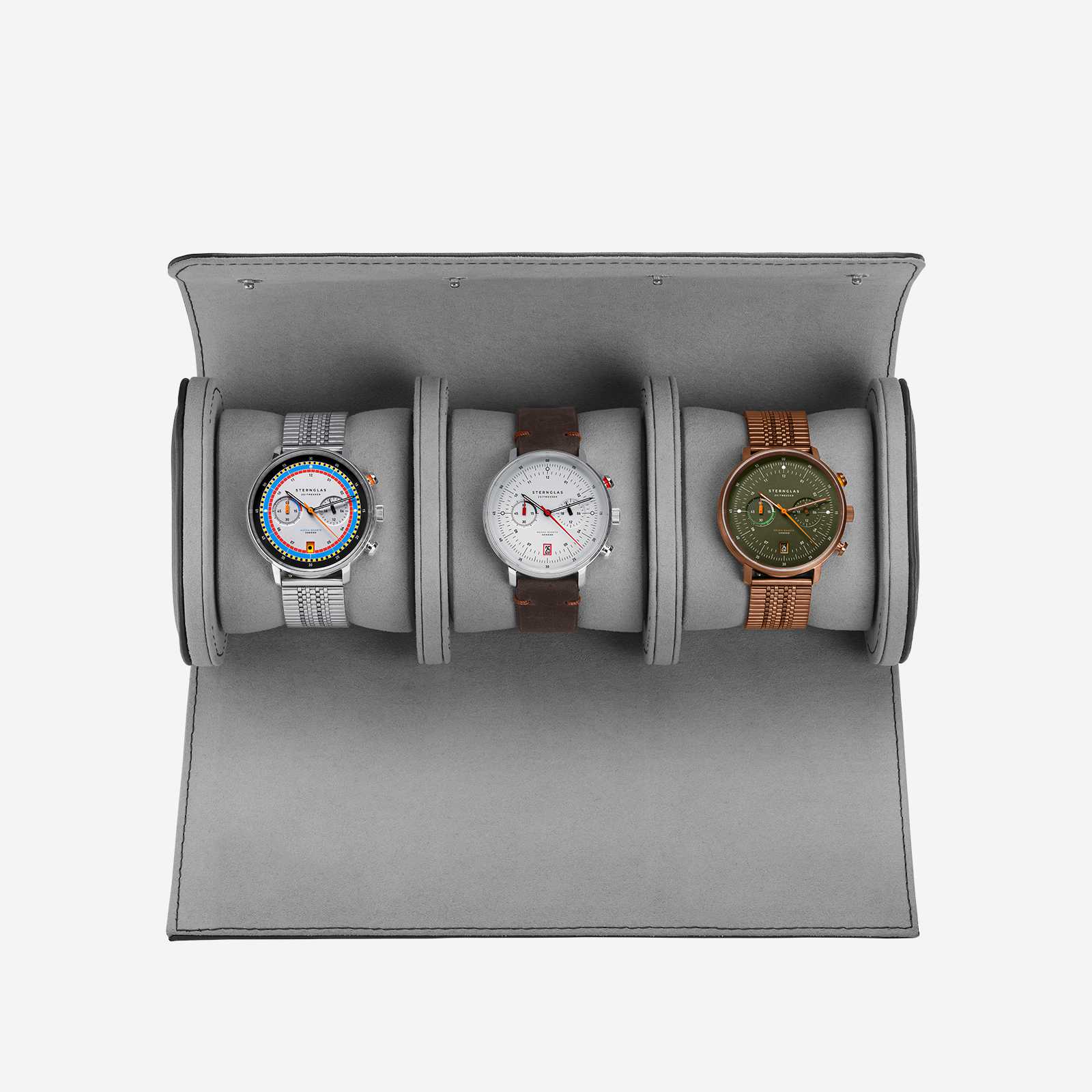 Mit der neuen STERNGLAS Uhrenrolle bringst Du Deine Zeitmesser stilvoll und sicher ans Ziel. Diese hochwertige Uhrenrolle bietet Platz für bis zu drei Deiner liebsten STERNGLAS Modelle und ist der ideale Begleiter auf Reisen oder zur stilvollen Aufbewahrung zu Hause. Die abnehmbaren Kissen mit praktischen Druckknöpfen ermöglichen ein müheloses Einsetzen und Entnehmen Deiner Uhren, während das weiche Innenfutter für optimalen Schutz sorgt. Erhältlich in elegantem Schwarz oder edlem Dunkelbraun, veredelt durch das geprägte STERNGLAS Logo. Übrigens kommt die Uhrenrolle in einer hochwertigen Geschenkbox – einfach Geschenkpapier drum, und schon hast Du das perfekte Präsent für Uhrenenthusiasten.